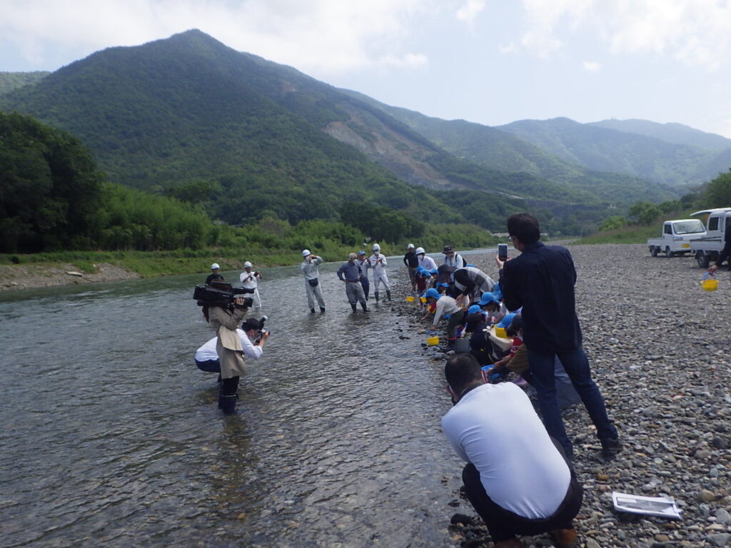 令和5年5月15日(月)10時より、中央建設株式会社は、社会貢献活動の一環として、肱川菅田地区で行われたアユ放流事業に協力参加いたしました。