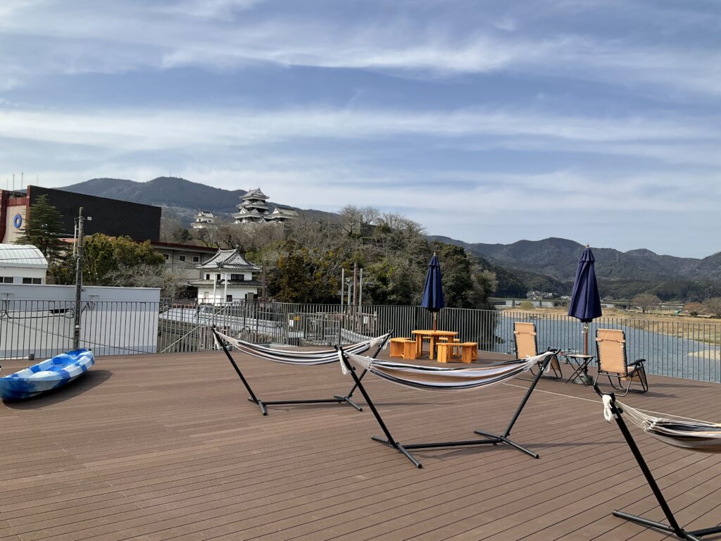 右を見れば川上側に冨士山と肱川橋、左を見れば川下側に大洲城と予讃線の鉄橋が望める、眺望抜群のビュースポット。
