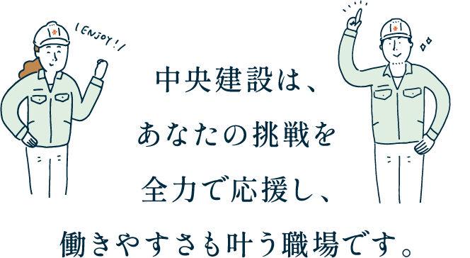 中央建設には、自ら考え、自ら動くことを大切にする社風があります。若手社員であっても積極的に仕事を任されることで、責任感が育ち、自分自身の成長を実感することができます。また、失敗を恐れず挑戦できるのも、仲間どうしで支え合い、失敗を学びに変えていく風土が根づいているから。安心してチャレンジできる職場環境が、日々の成長につながっています。